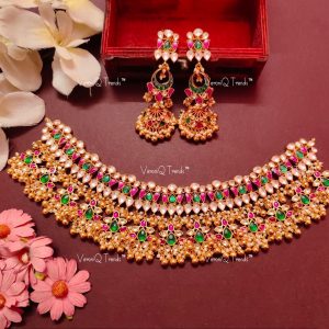 VeroniQ Trends-Polki Choker Necklace with Ruby Drops and Pearls,Jadau Jewelry,Jhumka,Wedding Jewelry,Party Wear,Ahmedabadi Kundan-M