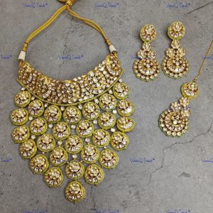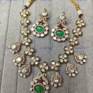 Rated 5.00 out of 5₹ 36,000.00₹ 27,500.00Each piece of VeroniQ Trends jewellery is expertly crafted and loving hand-finished by VeroniQ Trends talented crafts people, who bring the jewellery to life with meticulous attention to detail, skilfully setting sparkling stones or applying colourful enamel by hand. The material used to create VeroniQ Trends Jewellery are of highest quality and each hand finished piece goes through a vigorous quality control process to ensure it lives up to impressive standards that define VeroniQ Trends. It is advisable to avoid contact with water and organic chemicals i.e. perfume sprays. Store jewellery in airtight box. After use, wipe the jewellery with soft cotton cloth. Necklace with drawstring closure Earrings with push-back closures. Package contents - Necklace,Earrings,Tika P.S-Please drop a message for any customisation request. -