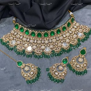 VeroniQ Trends-Traditional Bridal Polki And Emerald Choker Necklace Polki-Emerald Stone-Gold Plated-Wedding Jewelry-Punjabi Jewelry-South Indian-Thappa Jewelry