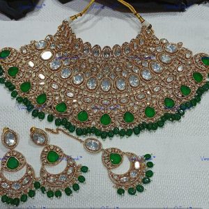 VeroniQ Trends-Traditional Bridal Emerald Green Beads Kundan Polki Long Choker Necklace With Earrings Haath Phool Maang Tika And Matha Patti Polki-Gold Plated-Wedding Jewelry-Punjabi Jewelry-South Indian-Thappa Jewelry