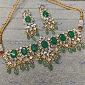 VeroniQ Trends-Elegant Emerald Green And Polki Choker Necklace Polki-Gold Plated-Wedding Jewelry-Punjabi Jewelry-South Indian-Thappa Jewelry