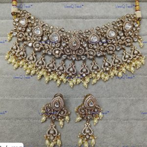 VeroniQ Trends-Victorian Gold Plated Polki Choker Necklace With Pearl Drop Polki-Gold Plated-Wedding Jewelry-Punjabi Jewelry-South Indian-Thappa Jewelry