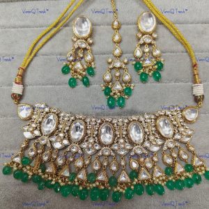 VeroniQ Trends-Bridal Meenakari Gold Plated Emerald Green Beads Kundan Polki Choker Necklace With Chandbali Earrings And Maang Tika Polki-Gold Plated-Wedding Jewelry-Punjabi Jewelry-South Indian-Thappa Jewelry