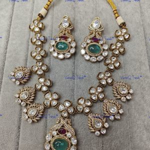 Rated 5.00 out of 5₹ 36,000.00₹ 29,500.00Each piece of VeroniQ Trends jewellery is expertly crafted and loving hand-finished by VeroniQ Trends talented crafts people, who bring the jewellery to life with meticulous attention to detail, skilfully setting sparkling stones or applying colourful enamel by hand. The material used to create VeroniQ Trends Jewellery are of highest quality and each hand finished piece goes through a vigorous quality control process to ensure it lives up to impressive standards that define VeroniQ Trends. It is advisable to avoid contact with water and organic chemicals i.e. perfume sprays. Store jewellery in airtight box. After use, wipe the jewellery with soft cotton cloth. Necklace with drawstring closure Earrings with push-back closures. Package contents - Necklace , Earrings -