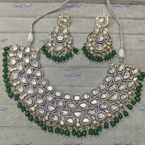 VeroniQ Trends-Inspired Bridal Necklace with Polki Stones-Choker Necklace in Polki Kundan-Emeralds-Wedding Jewelry-Bridal-Indian Jewelry-RR