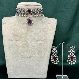 VeroniQ Trends-Bollywood Style Choker Necklace With Earrings in 92.5 Silver Moissanite Polki And Ruby Beads-Wedding Jewelry-Cocktail Party-South Indian-Thappa-PG