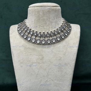 VeroniQ Trends- Victorian Pearl and Polki Choker Necklace 92.5 Sliver Moissanite Diamond Polki-Fresh Water Pearl-Gold Plated-Wedding Jewelry-Punjabi Jewelry-South Indian-Thappa Jewelry