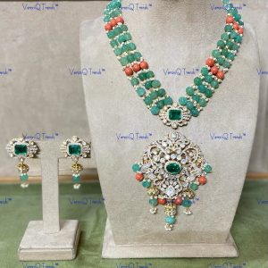 VeroniQ Trends-Real Silver Gold Plated Necklace in Fine Moissanite Polki With Beryl Beads-Wedding Jewelry-South Indian-MG