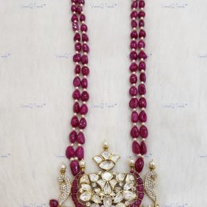 VeroniQ Trends-Elegant Victorian Ruby Beads Polki Silver Long Necklace With Peacock Motif 92.5 Silver Moissanite Diamond Polki-Gold Plated-Wedding Jewelry-Punjabi Jewelry-South Indian-Thappa Jewelry