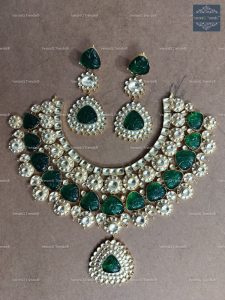 All our jewelry is handcrafted and therefore variations may occur. This necklace is handcrafted in Brass with gold plating, studded with Pachi Polki Stones Setting.