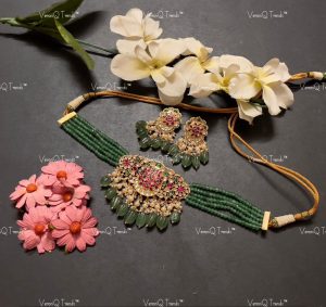 All our jewelry is handcrafted and therefore variations may occur. This necklace is handcrafted in Brass with gold plating, studded with Pachi Kundan Stones Setting with Kemp Stone.
