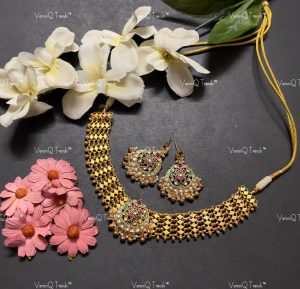 All our jewelry is handcrafted and therefore variations may occur. This necklace is handcrafted in Brass with gold plating, studded with Pachi Kundan Stones Setting.