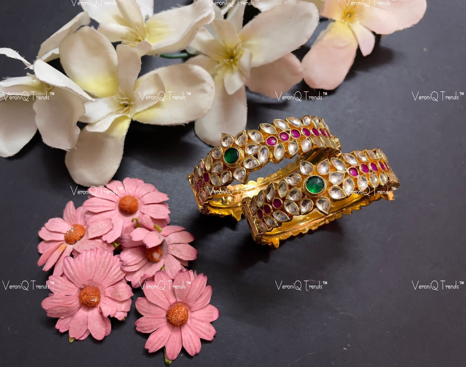 All our jewelry is handcrafted and therefore variations may occur. This bangles is handcrafted in Brass with gold plating, studded with Pachi Kundan Stones Setting.