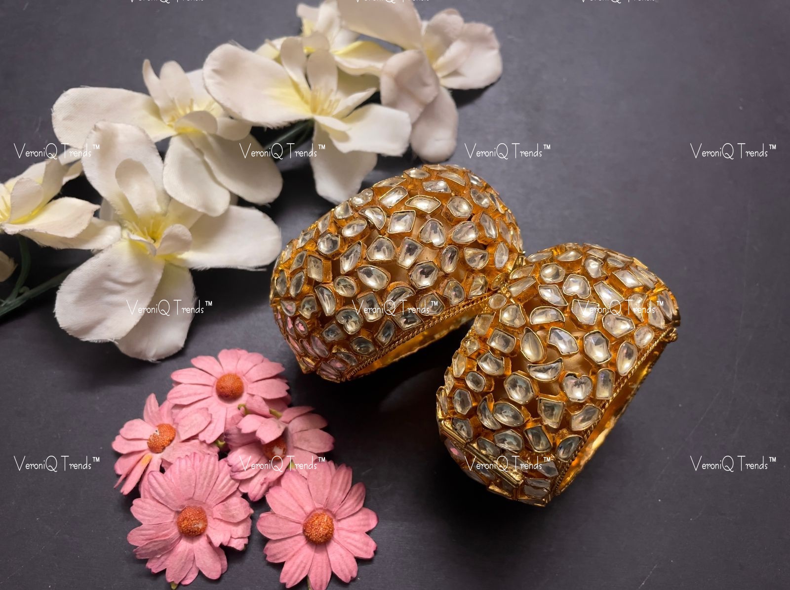 All our jewelry is handcrafted and therefore variations may occur. This bangles is handcrafted in Brass with gold plating, studded with Pachi Kundan Stones Setting.