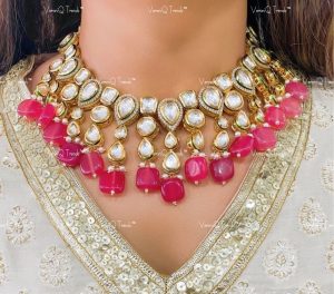 All our jewelry is handcrafted and therefore variations may occur. This Necklace is handcrafted in Brass with gold plating, studded with Pachi Kundan Stones Setting.