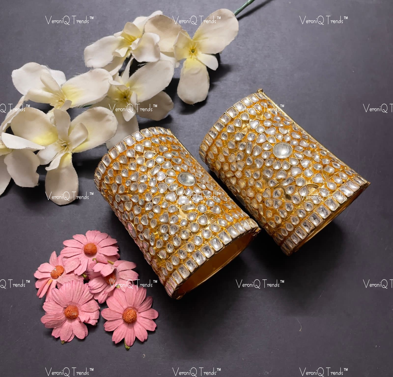 All our jewelry is handcrafted and therefore variations may occur. This bangles is handcrafted in Brass with gold plating, studded with Pachi Kundan Stones Setting.
