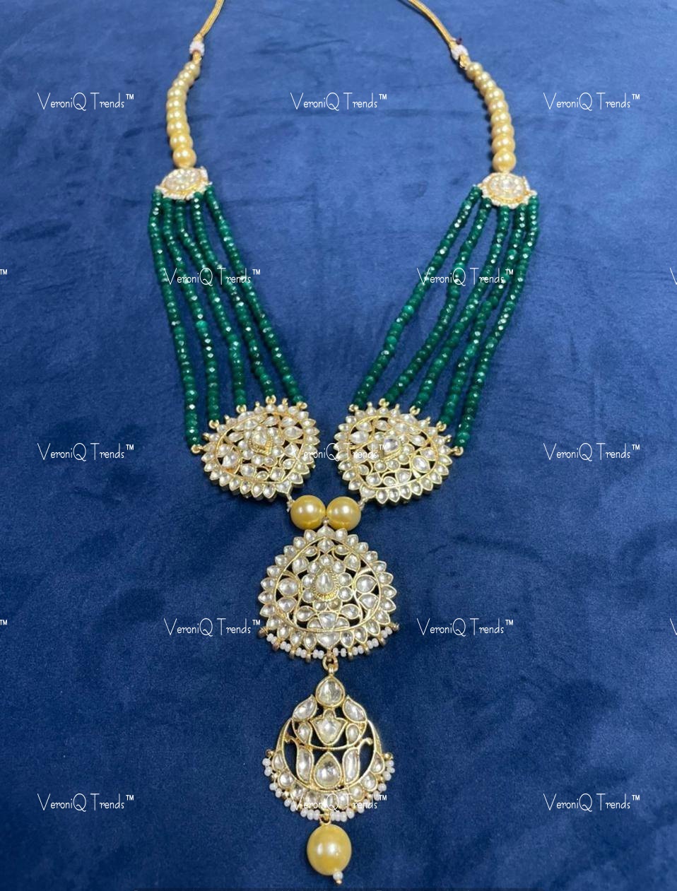 VeroniQ Trends-Traditional Multistrand Green Beaded Gold Plated Pachi Kundan Long Necklace Pachi Kundan-Gold Plated-Wedding Jewelry-Punjabi Jewelry-South Indian-Thappa Jewelry