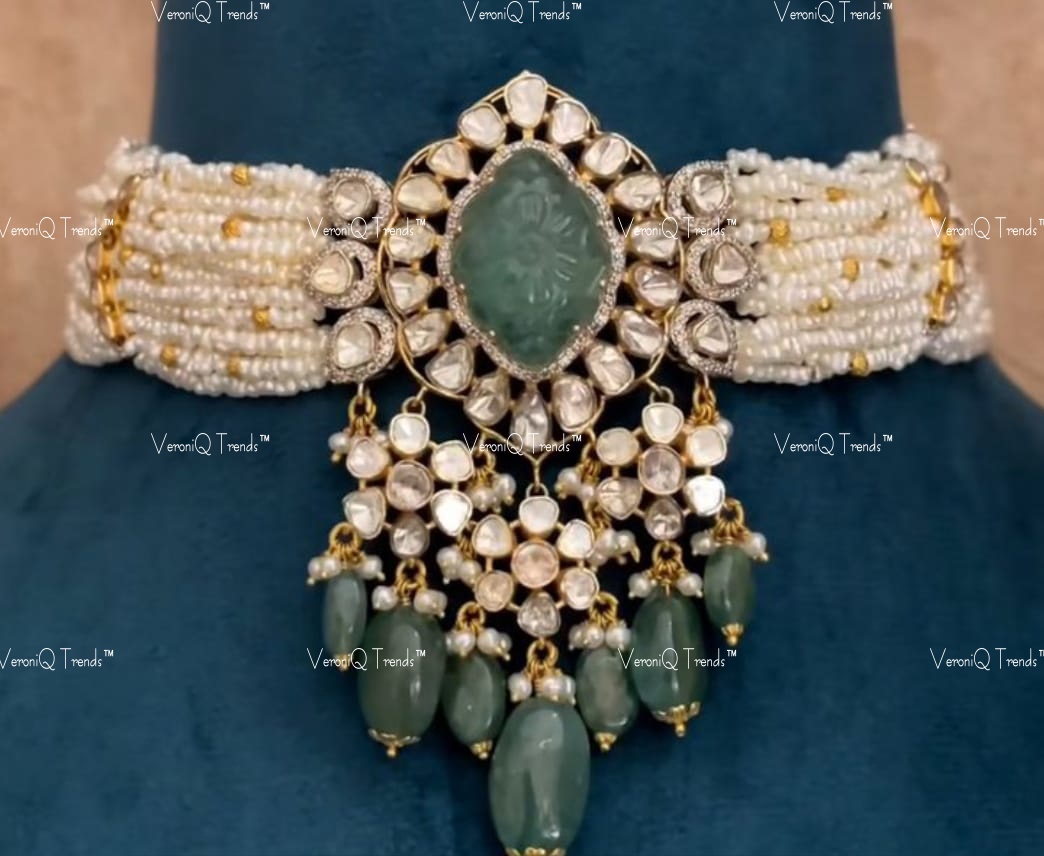 This statement necklace features a beautiful composition of Silver Metal with Moissanite Polki with Beryl beads and Fresh Water Pearls.