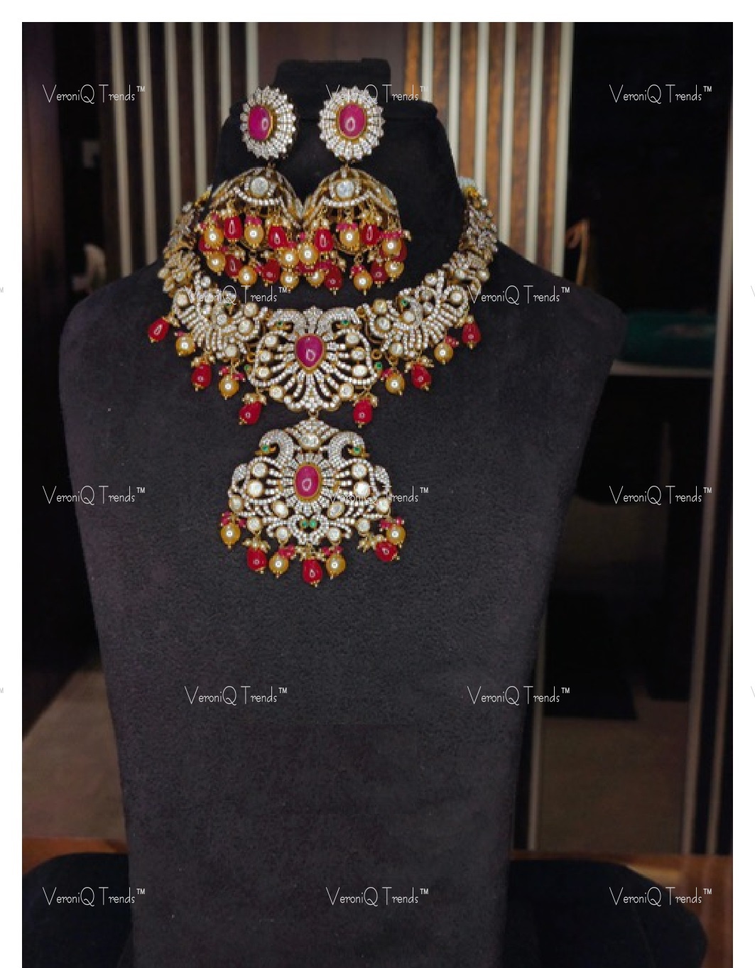 All our jewelry is handcrafted and therefore variations may occur. This necklace is handcrafted in silver with gold plating, studded with Moissanite Polki Stones Setting with Ruby Stone and AAA+ quality CZ Stone.
