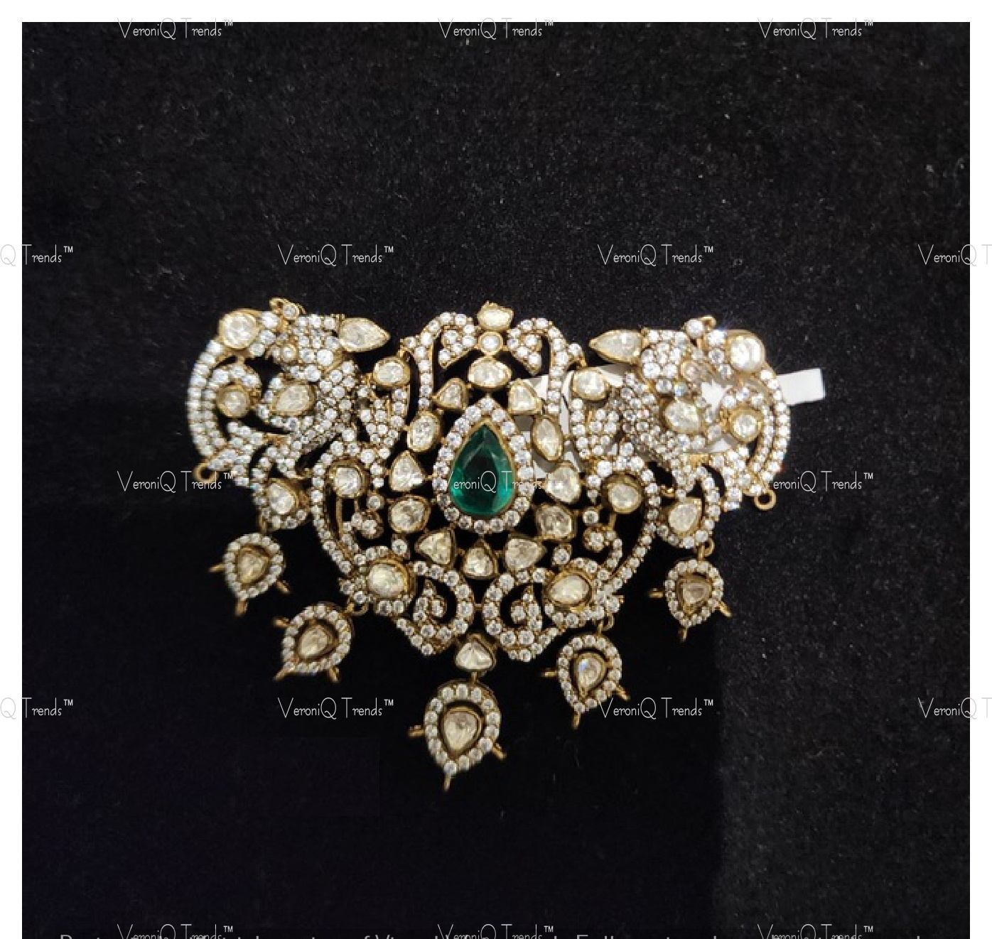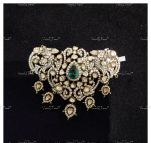 All our jewelry is handcrafted and therefore variations may occur. This pendant is handcrafted in silver with gold plating, studded with Moissanite Polki Stones Setting with Emerald Stone and AAA+ quality CZ Stone.