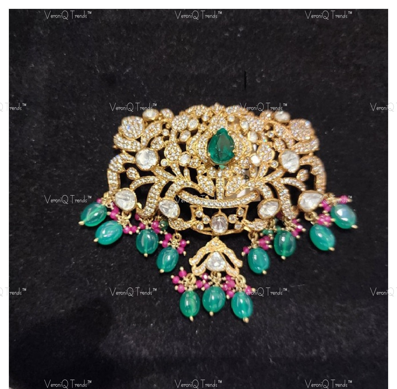 All our jewelry is handcrafted and therefore variations may occur. This Pendant is handcrafted in silver with gold plating, studded with Moissanite Polki Stones Setting with Emerald Stone, Emerald Green Beads and AAA+ quality CZ Stone.