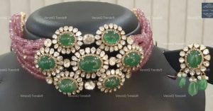 All our jewelry is handcrafted and therefore variations may occur. This necklace is handcrafted in silver with gold plating, studded with Moissanite Polki Stones Setting with Ruby Stone and AAA+ CZ Stone.