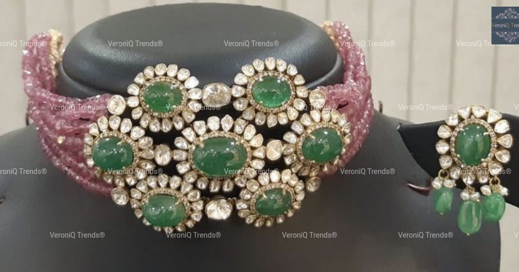 This statement necklace features a beautiful composition of Silver Metal with Moissanite Polki with Beryl beads and Fresh Water Pearls.