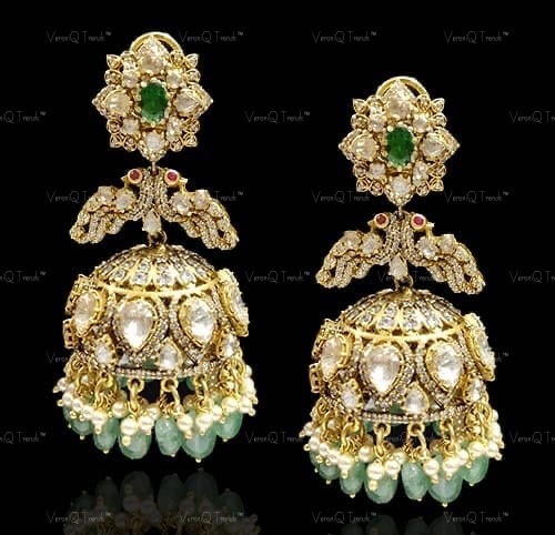VeroniQ Trends-Victorian Polki And Emerald Jhumka Earring With Motif 92.5 Silver Moissanite Diamond Polki-Emerald Stone-Gold Plated-Wedding Jewelry-Punjabi Jewelry-South Indian-Thappa Jewelry