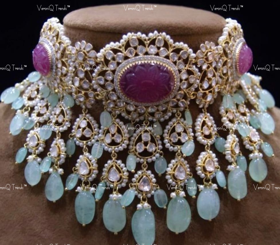 All our jewelry is handcrafted and therefore variations may occur. This necklace is handcrafted in silver with gold plating, studded with Moissanite Polki Stones Setting with Ruby Stone, Amethyst Beads and AAA+ quality CZ Stone.