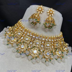 VeroniQ Trends-Elegant Party Wear Gold Plated Pachi Kundan Choker Necklace With Green Beads Pachi Kundan-Gold Plated-Wedding Jewelry-Punjabi Jewelry-South Indian-Thappa Jewelry