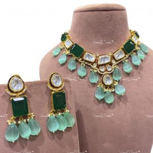 VeroniQ Trends-Beautiful Kundan Meenakari Necklace in Mint Aqua Gemstone Kundan-Gold Plated-Wedding Jewelry-Punjabi Jewelry-South Indian-Thappa Jewelry